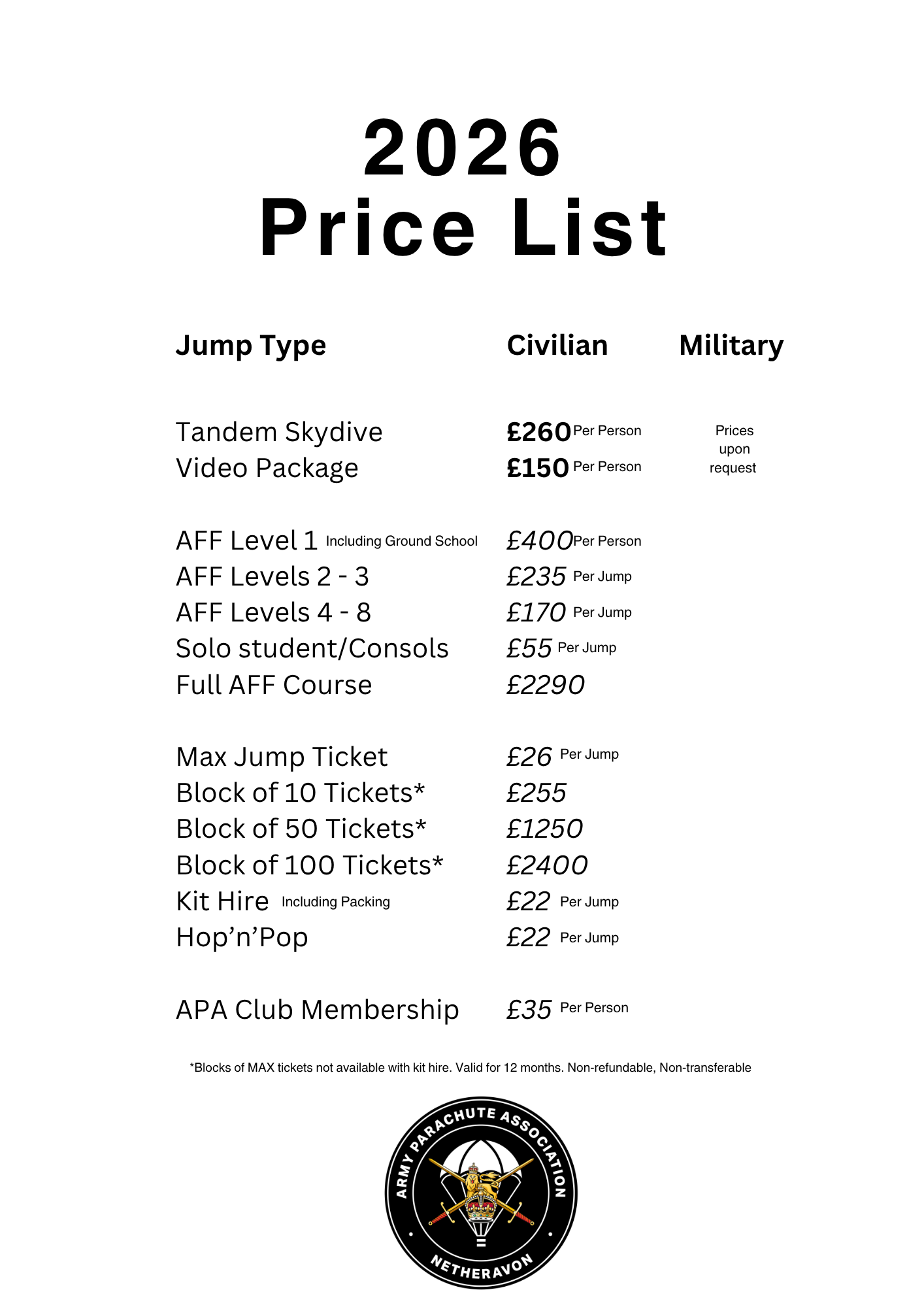 We are able to offer competitive pricing across our range of experiences and jump tickets with group discounts available on Tandem Skydives and military discount available across the board *excluding the video package*